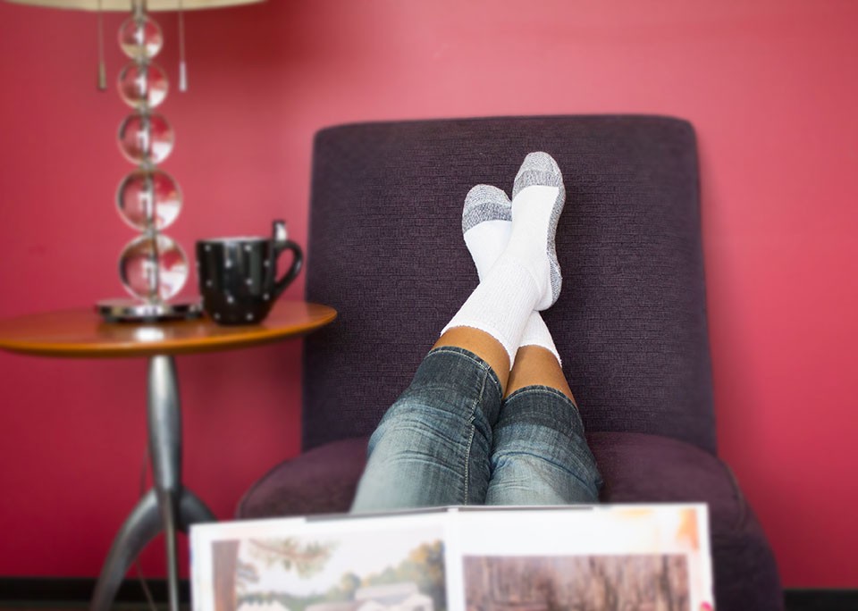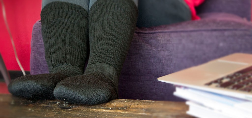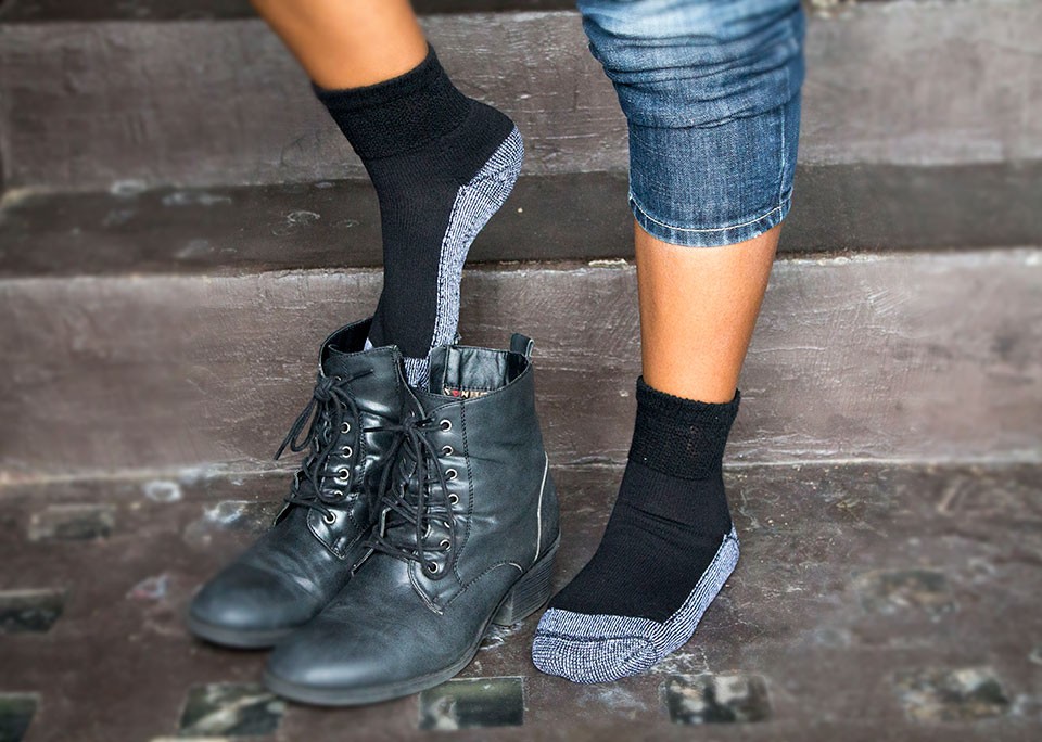 Acrylic fiber is a man made fiber material. It is lightweight, soft and warm and has some moisture wicking properties. Acrylic also has a smooth texture. The disadvantages of acrylic are that it tends to fuzz or peel easily if improperly washed or dried in heat. Suggested care would be to turn the socks inside out, wash in cold water and air dry. *Caution, NO BLEACH, this will discolor the material.
